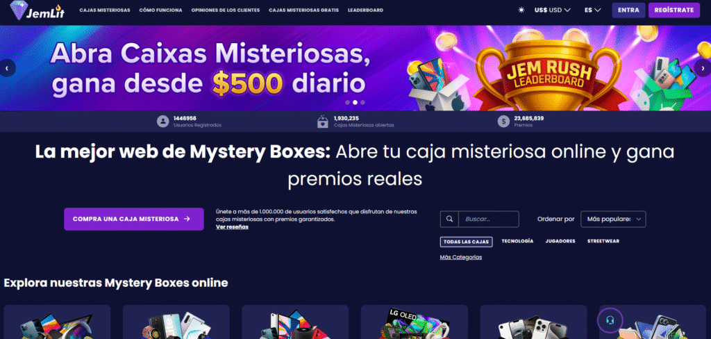 Sitios web especializados en cajas misteriosas: Plataformas como Jemlit ofrecen cajas misteriosas al instante, con envíos a domicilio de los premios obtenidos.